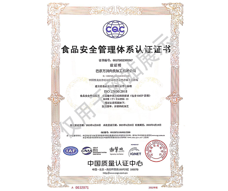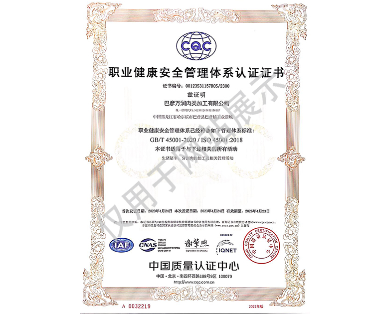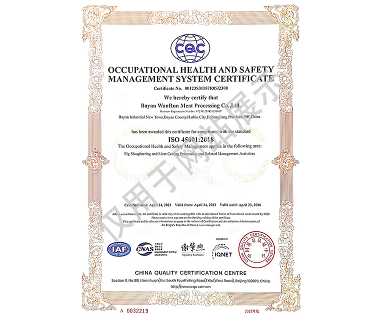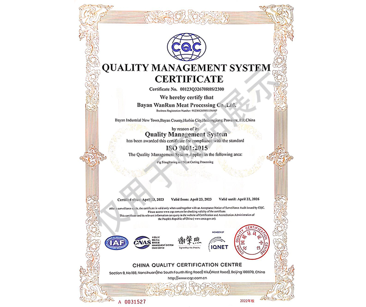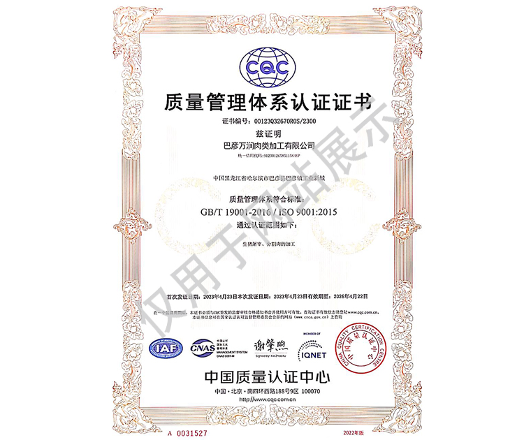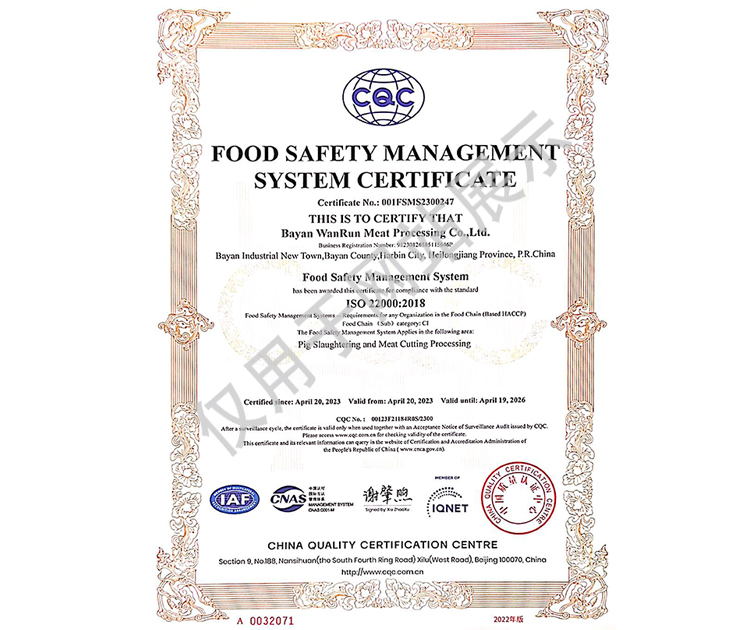 2016年公司通過了中國質(zhì)量認證中心的質(zhì)量管理體系(ISO9001)和食品安全管理體系(ISO22000)認證;2017年已取得國家進出口企業(yè)認證;是中國肉類協(xié)會會員單位,黑龍江省肉類協(xié)會副會長單位;2017年,公司產(chǎn)品經(jīng)中國綠色食品發(fā)展中心審核,被認定為綠色食品A級產(chǎn)品;被省畜牧獸醫(yī)局確定為全國生豬屠宰標準化創(chuàng)建示范企業(yè)(全國僅6家)。2018年12月,被評定為市級農(nóng)業(yè)產(chǎn)業(yè)化重點龍頭企業(yè)。2019年1月,被評定為省級農(nóng)業(yè)產(chǎn)業(yè)化龍頭企業(yè)。