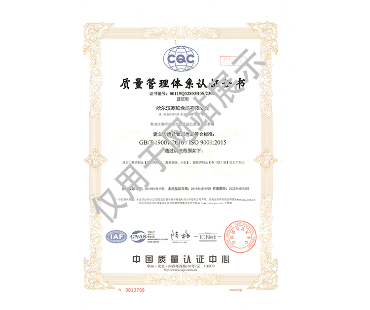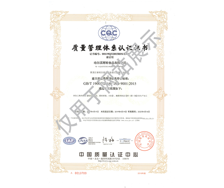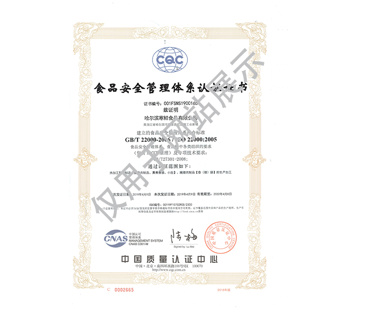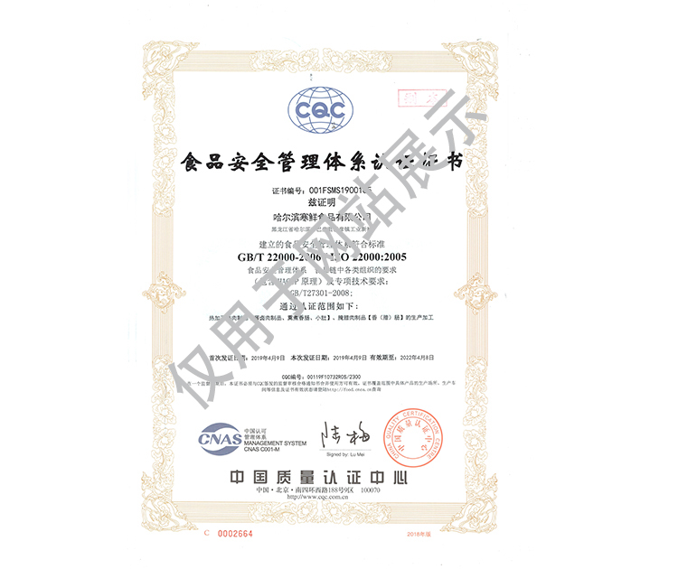 2016年公司通過了中國質量認證中心的質量管理體系(ISO9001)和食品安全管理體系(ISO22000)認證;2017年已取得國家進出口企業認證;是中國肉類協會會員單位,黑龍江省肉類協會副會長單位;2017年,公司產品經中國綠色食品發展中心審核,被認定為綠色食品A級產品;被省畜牧獸醫局確定為全國生豬屠宰標準化創建示范企業(全國僅6家)。2018年12月,被評定為市級農業產業化重點龍頭企業。2019年1月,被評定為省級農業產業化龍頭企業。