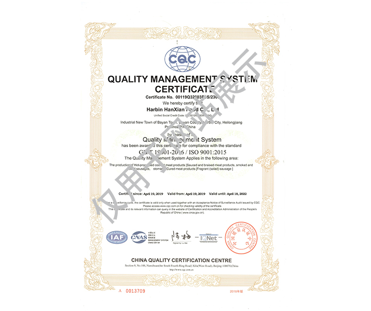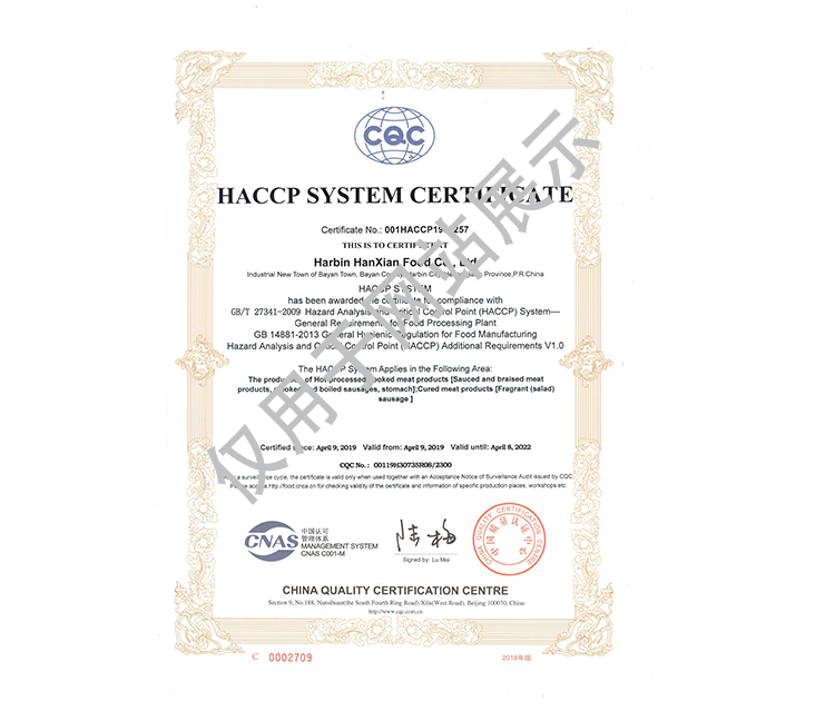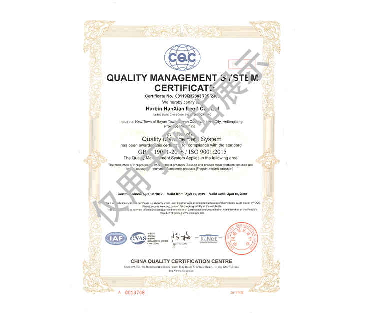 2016年公司通過(guò)了中國(guó)質(zhì)量認(rèn)證中心的質(zhì)量管理體系(ISO9001)和食品安全管理體系(ISO22000)認(rèn)證;2017年已取得國(guó)家進(jìn)出口企業(yè)認(rèn)證;是中國(guó)肉類(lèi)協(xié)會(huì)會(huì)員單位,黑龍江省肉類(lèi)協(xié)會(huì)副會(huì)長(zhǎng)單位;2017年,公司產(chǎn)品經(jīng)中國(guó)綠色食品發(fā)展中心審核,被認(rèn)定為綠色食品A級(jí)產(chǎn)品;被省畜牧獸醫(yī)局確定為全國(guó)生豬屠宰標(biāo)準(zhǔn)化創(chuàng)建示范企業(yè)(全國(guó)僅6家)。2018年12月,被評(píng)定為市級(jí)農(nóng)業(yè)產(chǎn)業(yè)化重點(diǎn)龍頭企業(yè)。2019年1月,被評(píng)定為省級(jí)農(nóng)業(yè)產(chǎn)業(yè)化龍頭企業(yè)。